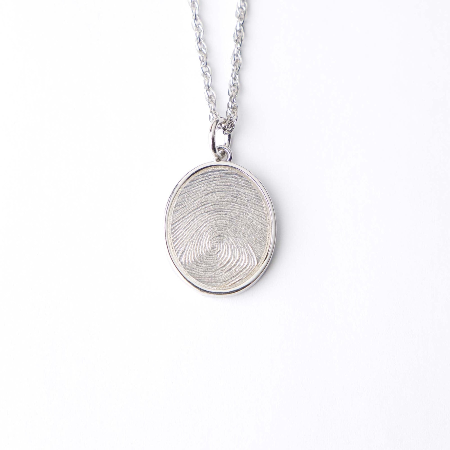 My Living Touch™ Oval Fingerprint Pendant is made from sterling silver and is handcrafted with care by our artisan jewelers.  This classic oval shaped pendant includes a rimmed border, which artfully displays a fingerprint. Exclusively designed, and hand polished the Oval Pendant is a unique keepsake that lasts.